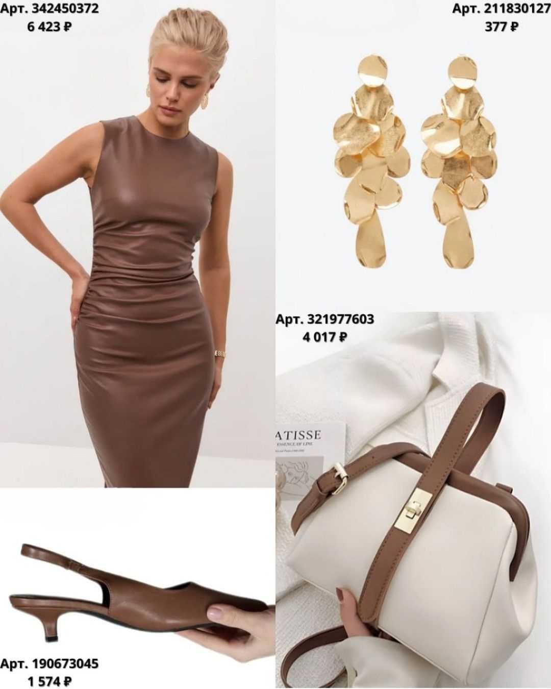 Благородные коричневые оттенки кожи и безупречный силуэт подчеркивают фигуру, создавая изысканный и дорого выглядящий образ.